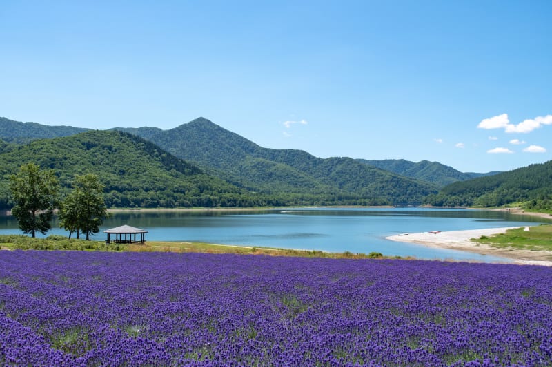 旭川から車で約1時間50分。南富良野町にある『かなやま湖』は、夏はラベンダー畑が広がり、湖とのコントラストが美しいスポット。冬には一面の銀世界のなか、温かな環境でワカサギ釣りを楽しめます。