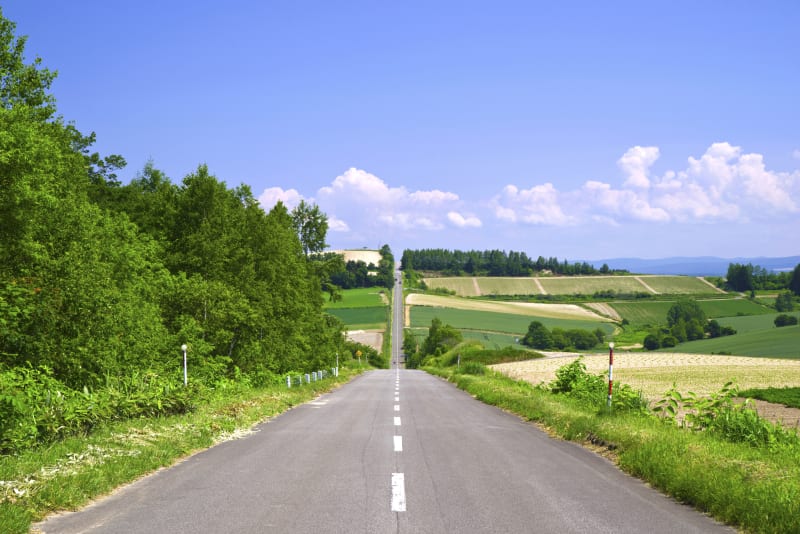 旭川空港から車で約30分。上富良野町にある『ジェットコースターの路』は、アップダウンの激しい直線道路が4.5km続く長い1本道。国道237号線沿いにある「西11線農免農道」の標識を目印にして、曲がった先にあります。