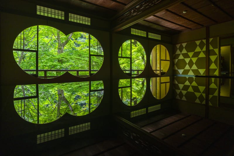 嵐山祐斎亭の魅力は、四季折々に移り変わる美しい景色。特に丸窓の景色は、机や水面に映り込むシンメトリーな絶景が広がります。