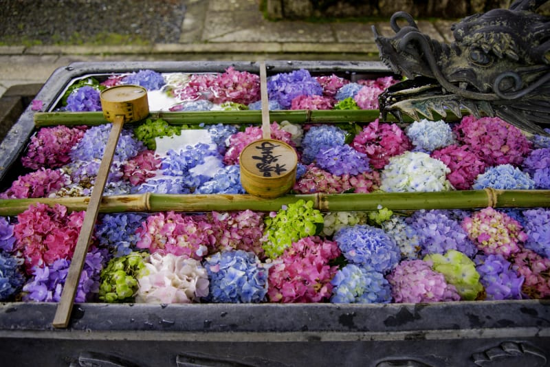 楊谷寺は紫陽花や紅葉など、季節ごとに移り変わる景色も見どころ。鮮やかな花手水の発祥の地としてSNSを中心に話題になっています! 手を浄める手水舎は四季の草花で彩られ、四季の美しさや癒しを感じられますよ。