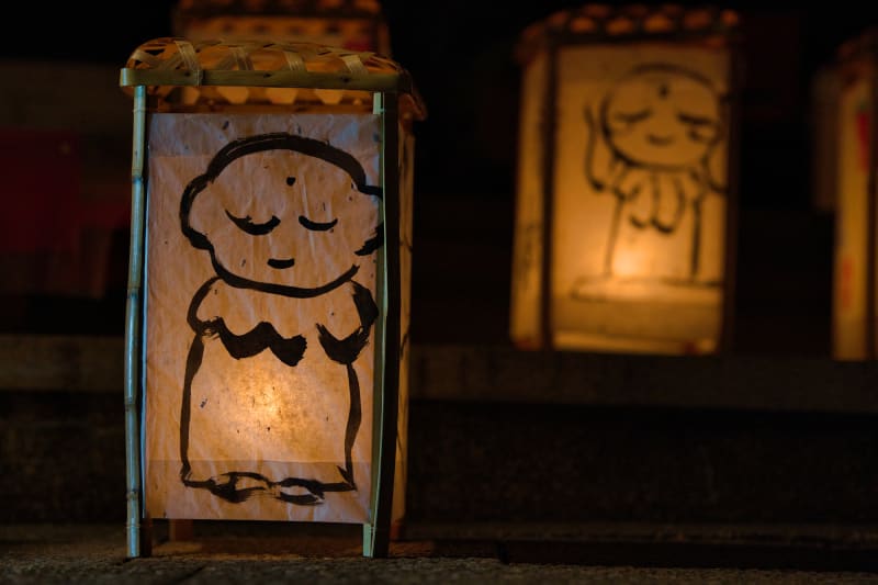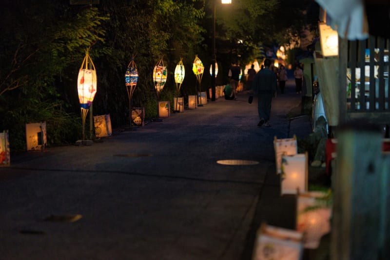 お地蔵様に見立てたジャンボ提灯や子どもたちが描いた提灯など、個性豊かな提灯が並ぶ様子はどこか懐かしく楽しい雰囲気。