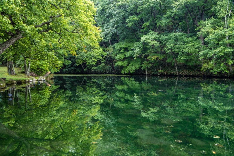 森の中の沼は、空や周囲の森が写り込むリフレクションが美しい! 夏の新緑が彩る鮮やかな「緑沼」や夕日のオレンジを目に焼き付けて♪