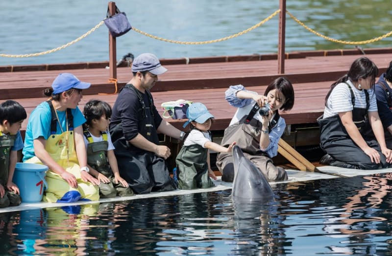 見学コースでは、桟橋へ入って間近でイルカを見ることができ、ふれあいコースではイルカに握手やキスすることも。スイムコースではイルカと一緒に泳げ、より近くで触れ合えますよ。