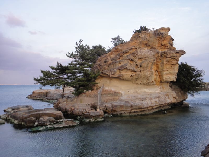 長い間波によって形成されてきた独特の造形美が非常に美しく、夜間にはライトアップも楽しめます。駐車場は徒歩1分の岩屋ポートパーキングを利用するのが便利です。