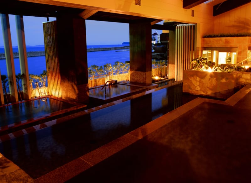 一日しっかり遊んだら、ホテルでゆっくり休みましょう。『イングランドの丘』から車で45分ほどの場所にある『ホテルニューアワジ』は、数ある淡路島のホテルの中でも特に人気が高く、温泉好きにはたまらない、3つの湯船と2つの源泉の湯を楽しめるホテルです。