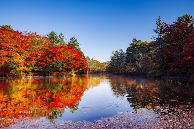特に10月中旬頃から11月上旬頃にかけては、鮮やかな赤色に染まった紅葉が池に映し出され、とても美しい秋の景色を鑑賞できます。
