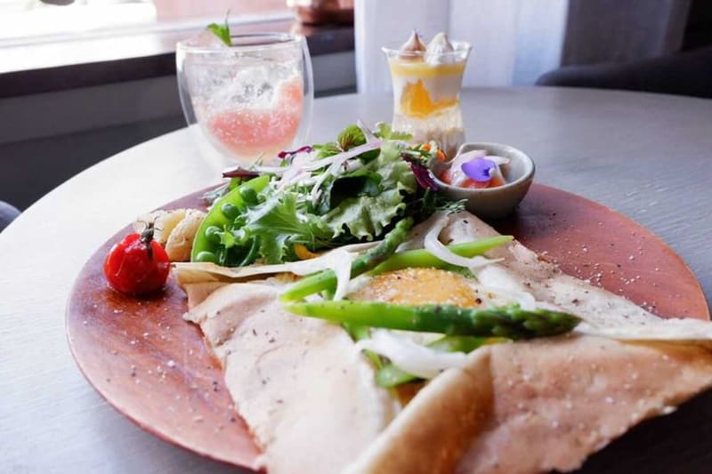 早めにお昼を食べたので、そろそろ小腹が空いてくるころかも。そんなときは、旬の野菜をたっぷりと使用した「季節の信州ガレット(春のグリーンアスパラと半熟卵のガレット)」がおすすめ!フルーツソーダにはフローズンの果肉がそのまま入っていますよ。