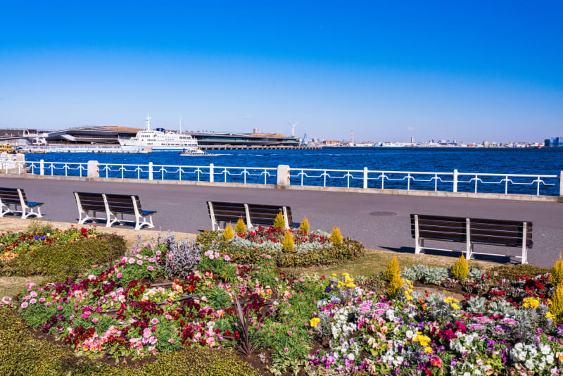 そのまま海沿いに進むと山下公園へ到着。山下公園には「未来のバラ園」と呼ばれるバラ園があり、春と秋には約3,000本のバラが咲き誇ります。