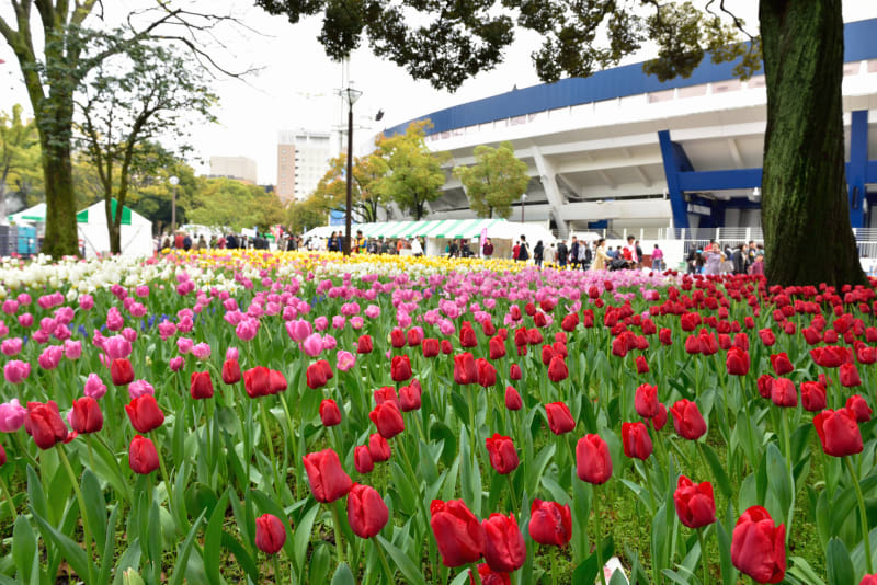 敷地内には春に見ごろを迎えるチューリップが、約70品種約14万球も植えられています。赤・ピンク・黄色・白など、色とりどりチューリップが一面に広がる景色は圧巻! 公園内をお散歩しながら、春のお花を楽しみましょう。