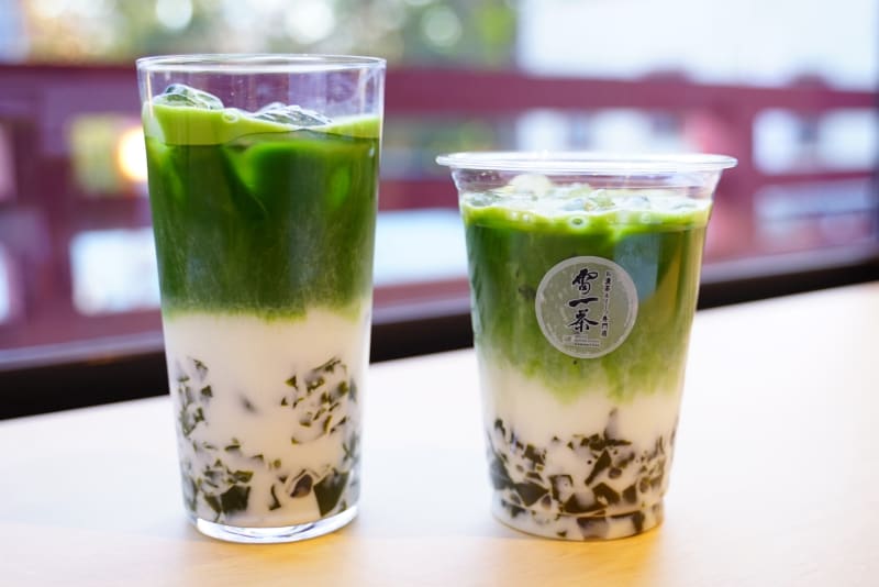 ぷるぷる食感のわらび餅の柔らかな甘みと濃厚なお濃茶ラテのバランスがよく、ここまでの疲れも癒やされること間違いなしです。