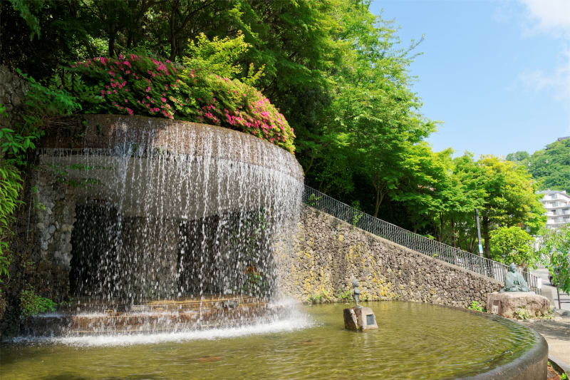 湯けむりに見立てた滝で涼を取りながらひと休み。滝の中央にあるかっぱ像は平成5年に札幌市定山渓温泉から記念として贈呈されました。定山渓温泉では「かっぱ伝説」が語り継がれており、街のシンボルになっているそうです。