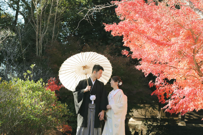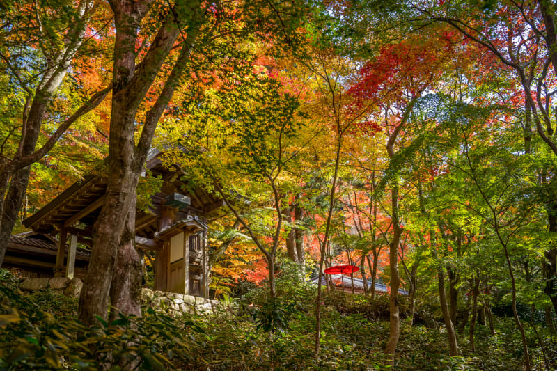 秋になると2,500本ものカエデが紅色に染まり、豊臣秀吉もその素晴らしさを絶賛したとか。カエデの景勝地としても知られている有名な紅葉スポットです。