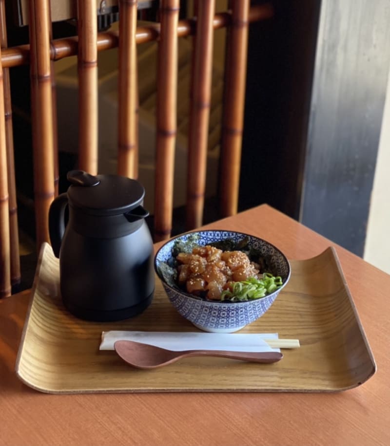 ランチにいただくのは、裏名物の『お茶漬けまぐろ丼』。京都・丹後のお米に、ごま油の香り豊かな漬けまぐろがたっぷりと乗っています。