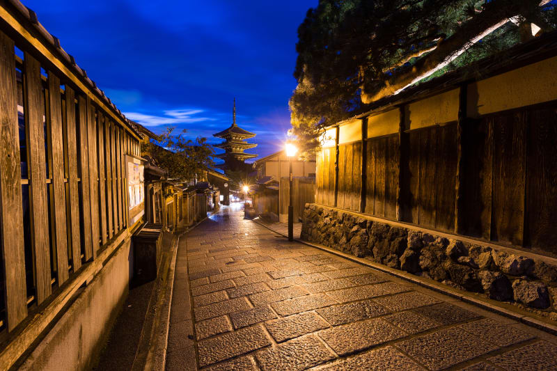 趣ある街並みに溶け込む五重塔・八坂の塔は、京都ならではの景色です。少し離れて全体像を眺めたり、近付いて下からの迫力あるアングルを撮影したりと、道中も飽きることなく楽しめます。陽が落ち、シルエットとして浮かび上がる塔の姿も素敵ですよ。