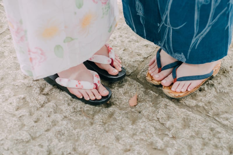 下駄を履いて歩く際には、すり足気味に歩くことを心掛けると良いですよ。裾がめくりあがりにくく、上品な歩き方に見えます。雨などで足場が悪い日も、泥水が跳ね返って着物を汚す心配が減りますよ。