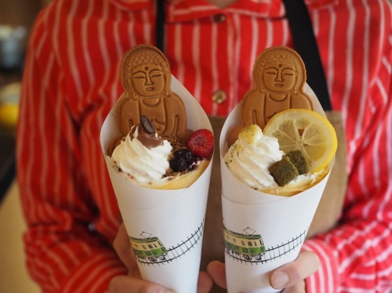 クレープは、鎌倉の大仏をかたどったビスケットと季節によって変わるトッピングが魅力。あまりのかわいさにシャッターをきる手が止まりません!