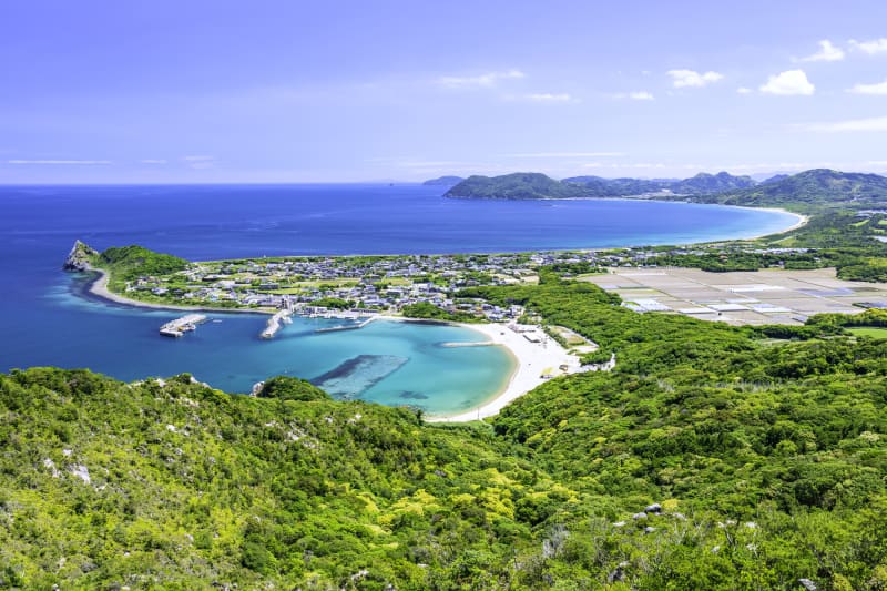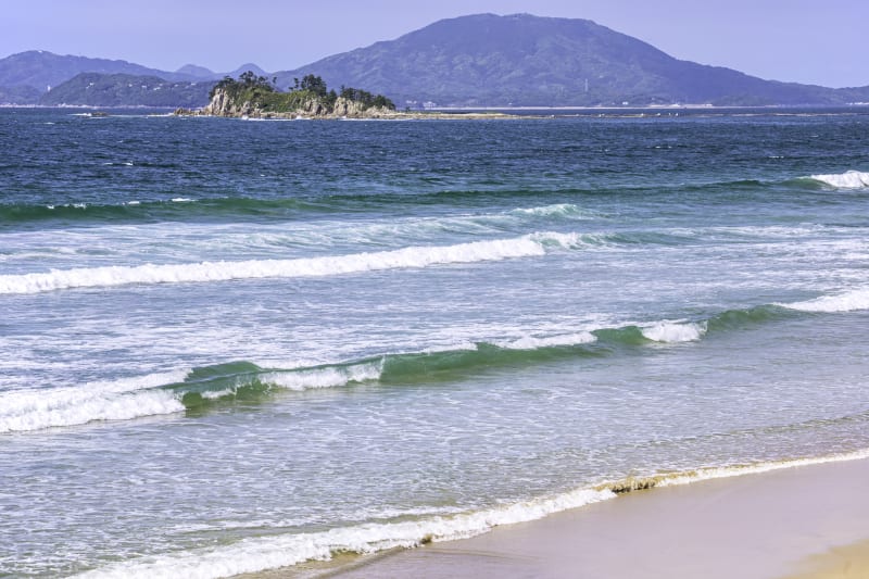 糸島市の西にある『姉子の浜(あねごのはま)』は、砂浜を歩くと「キュッキュッ」と不思議な音がする全国的にも珍しい砂浜。「鳴き砂」と呼ばれていて、不思議な音は石英の粒子が擦れることで発生します。鳴き砂はゴミが少なく綺麗な砂の証拠で、九州内には数箇所しか存在していません。快晴などの条件が揃えば、遠くに長崎県の壱岐島を望むことも。