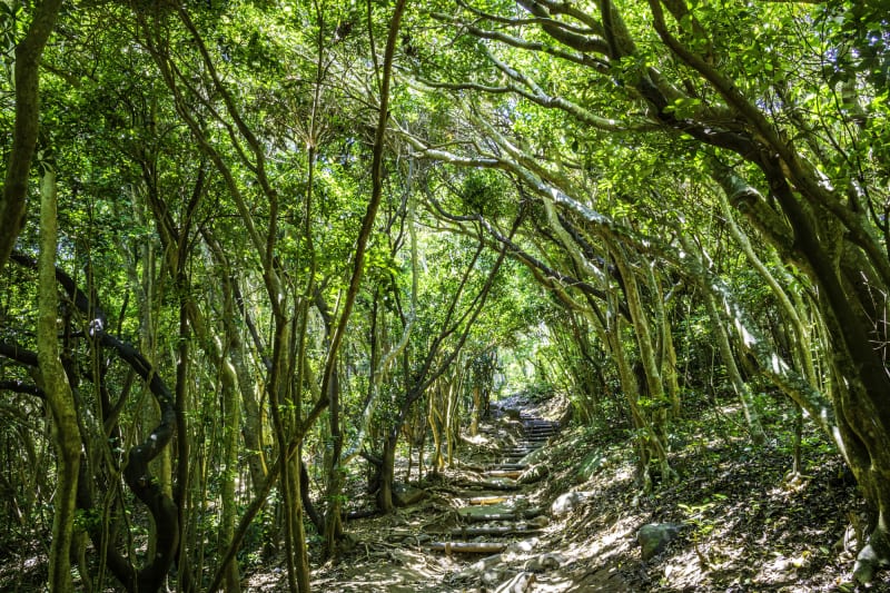 『芥屋の大門公園』は、遊覧船観光が有名な『芥屋の大門』近くにある公園。『芥屋の大門公園』のなかには、道の両脇の木々がトンネルになっている幻想的な場所も。約5分ほど歩けば展望台があり、断崖絶壁や玄界灘が一望できます。
