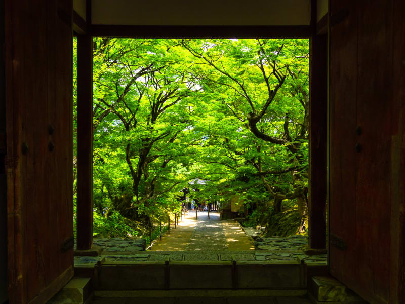 一般的な紅色のもみじだけでなく、力強く茂る青もみじも必見。一面を覆う苔と青もみじ、すらりと背を伸ばしている竹林が織りなす景色は圧巻です。