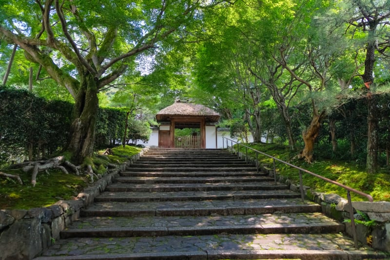 鈴虫の鳴き声が静かに響く境内からは京都市内を一望でき、四季折々の草花や歳月を重ねた石、苔、竹林などが楽しめます。