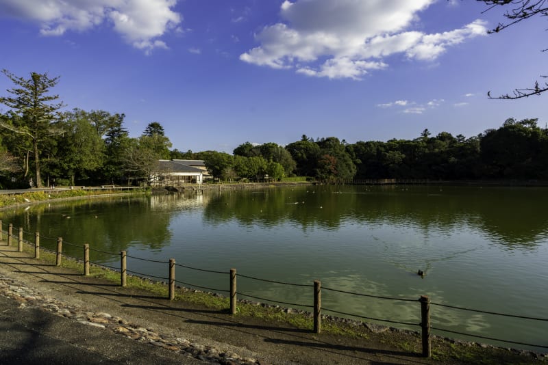 また広大な境内の横にある大きな「深田池」というため池では、カモがのんびりしている姿を見ることでき、厳かな雰囲気の橿原神宮とはまた違った風景が楽しめます。