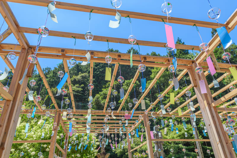 紫陽花が咲く季節には、「あじさい風鈴祭り」を開催。本堂の前にずらっと並んだ約1,000個(2020年開催時)の風鈴が、風に吹かれて揺れると一斉に涼やかな音色を奏でます。風鈴の音を聴きながら見る、紫陽花の美しさはひとしお。浴衣姿で訪れるのも、おすすめです。