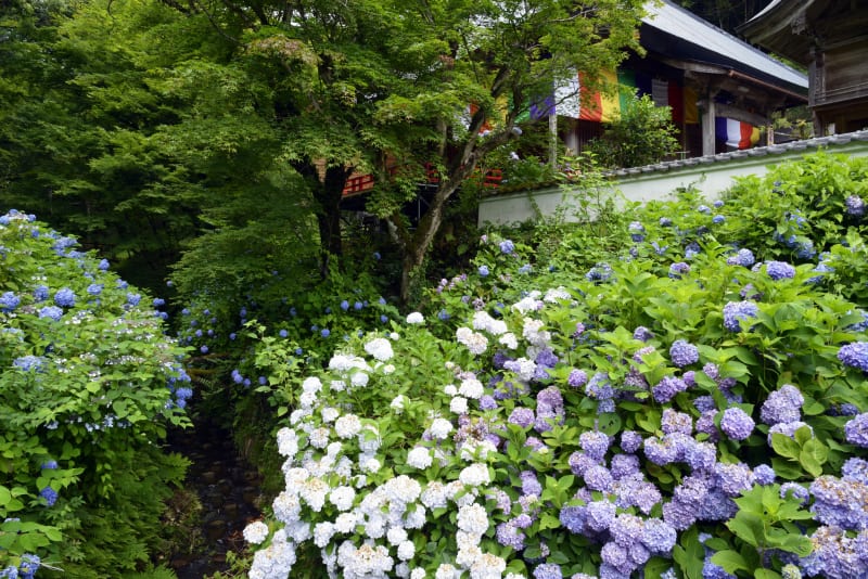 毎年約1,500株・30,000本の紫陽花が花を咲かせ、シーズン中には「あじさいまつり」も開催。境内には食事処もあるので、休憩を挟みながらゆっくりと紫陽花めぐりを楽しめます。