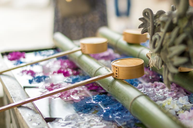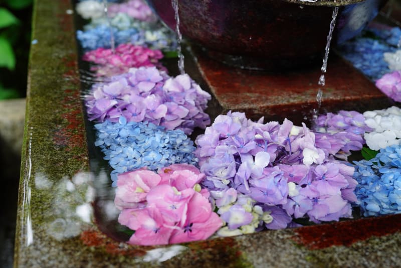 カラフルな紫陽花の水景に心惹かれる花手水(はなちょうず)。水面にぷかぷかと浮かぶ紫陽花がSNS映えすると近年話題に。