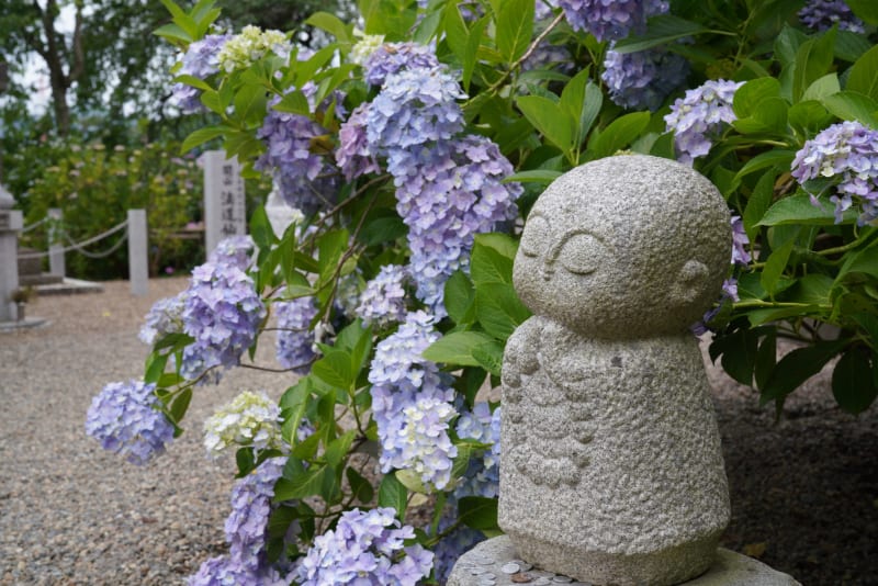 紫陽花めぐりの際には、境内の至るところでかわいいわらべ仏の姿も目にすることも。紫陽花をバックにたたずむ姿に癒やされること間違いなしです。
