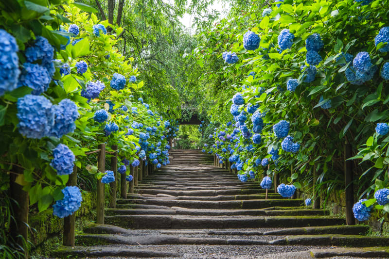 毎年6月上旬から下旬にかけて数千本もの紫陽花が花を咲かせ、「明月院ブルー」と呼ばれる鮮やかな青色であたり一面が染まります。
