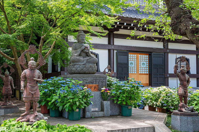紫陽花のほかにも、散策路上段から見える由比ヶ浜の眺望や、観音菩薩を展示と映像で紹介する「観音ミュージアム」、心癒される和み地蔵など、見どころ満載。鎌倉観光では、ぜひ立ち寄っていただきたいスポットです。
