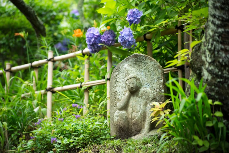 紫陽花は、山門や仏殿の周辺、法堂跡、佛日庵(ぶつにちあん)などに点在して咲いているため、境内を散策しながら紫陽花鑑賞を楽しんでみて。すぐ近くにある『明月院』と一緒に訪れるのがおすすめです。