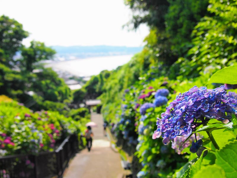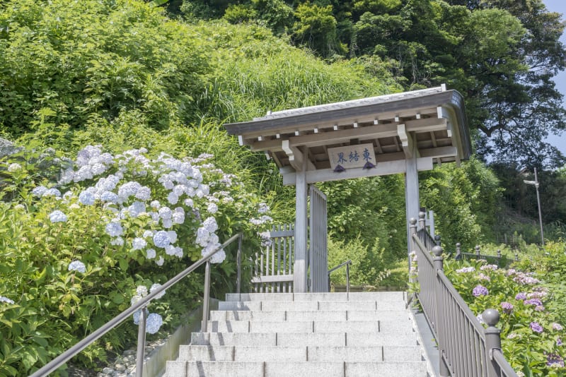極楽寺坂切通の途中に位置する『成就院(じょうじゅいん)』は、北条泰時が創建し、北条一族繁栄を祈ったとされる寺院。参道からは、遠くに由比ヶ浜と材木座海岸が見渡せ、フォトスポットとしても人気の高い場所です。