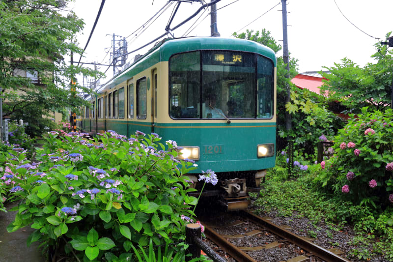 見ごろは例年6月中旬から下旬。紫陽花と江ノ電、鎌倉ならでは風景を思い出の一枚におさめてみて。