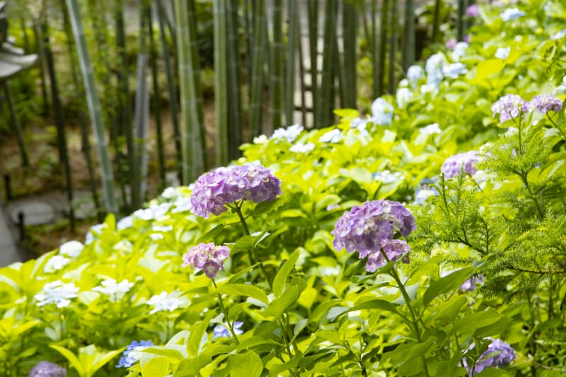 あじさい路では、色とりどりの紫陽花が小道に沿って咲き誇り、竹林と並ぶ初夏ならではの景色が広がっています。涼やかな風を感じながら、二人で初夏のお散歩を楽しみましょう。