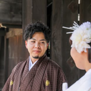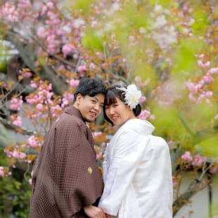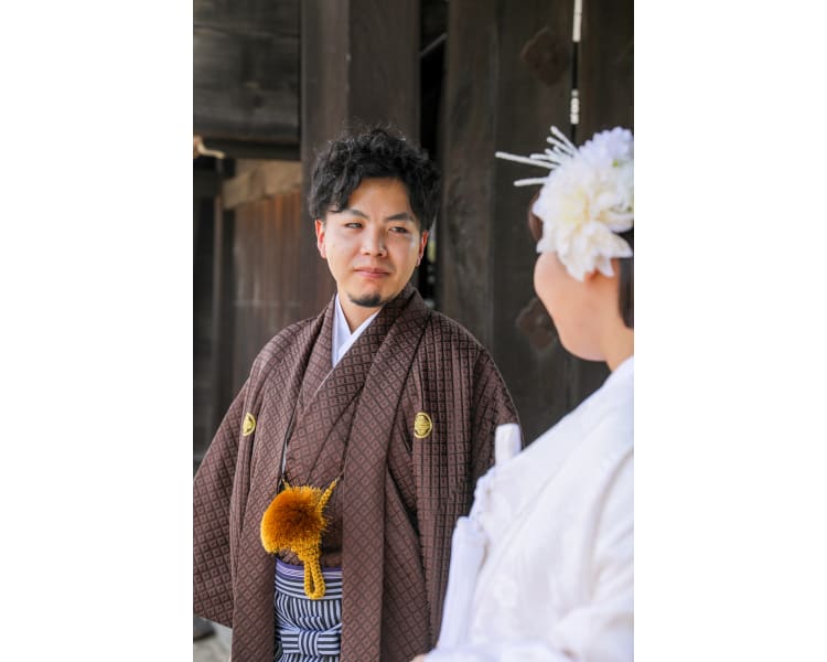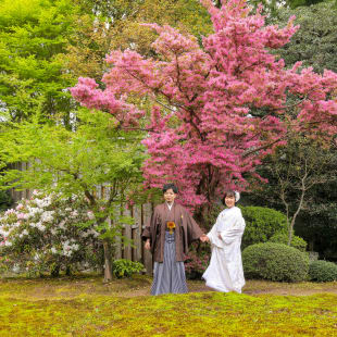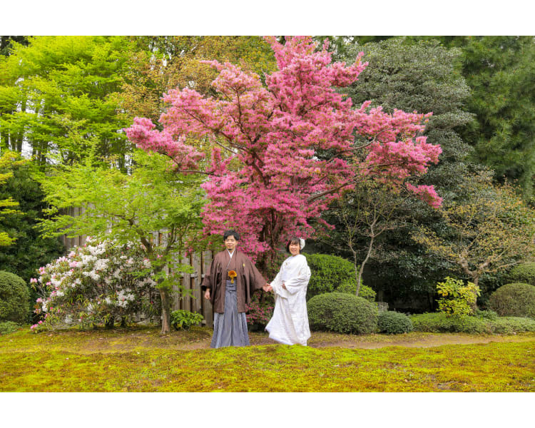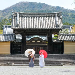 "藥医門"と紅白の番傘が、二人をより引き立たせます